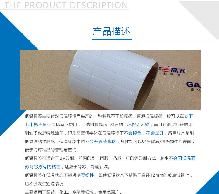 低溫標(biāo)簽主要針對低溫環(huán)境而生產(chǎn)的一種特殊不干膠標(biāo)簽,普通低溫標(biāo)簽一般可以在零下七十?dāng)z氏度低溫環(huán)境下使用,所選材料是pet材質(zhì)的,環(huán)保無污染,而且耐低溫標(biāo)簽的印刷油墨也是特殊油墨,印刷圖案何字體在低溫環(huán)境下不會掉色,不會暈開,所用膠水是耐低溫強粘性膠水,低溫環(huán)境中也不會開裂或脫落,其性能可以貼在霜凍/深凍物體的表面,便于冷庫物品的管理與查詢。