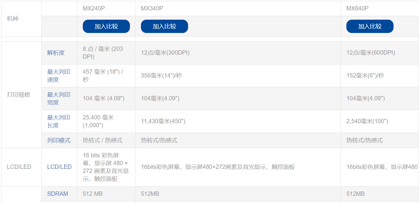 MX240P系列包含203 dpi,最高列印速度達每秒18英吋的MX240P、300 dpi最高列印速度達每秒14英吋的MX340P與600 dpi的MX640P適合于二維條碼、圖示、小字或其他超高解析列印需求之圖形標簽。
