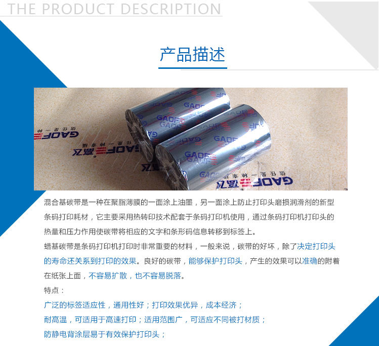 混合基碳帶品質高、高速打印性能,優異的耐磨擦、耐熱、耐腐蝕、耐久性能,耐磨能滿足各種苛刻環境要求,高敏感度,確保優異的圖像打印效果,防靜電背涂層,有效保護打印頭。