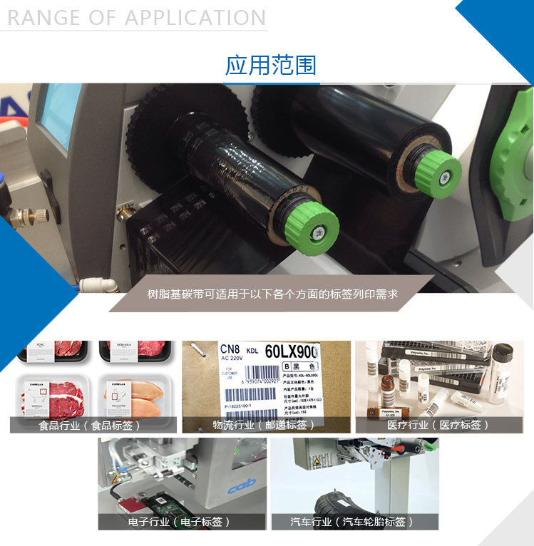 樹脂基碳帶是一種具有較強耐刮擦性,極強耐腐蝕性和長效性的打印耗材,在較低或適當溫度內打印,打印更加清晰,防靜電背涂層,更加有效地保護您昂貴的打印頭,尤其適合用于電器標簽打印,適合在各類條碼打印機上使用。