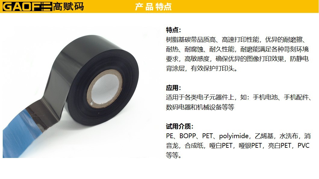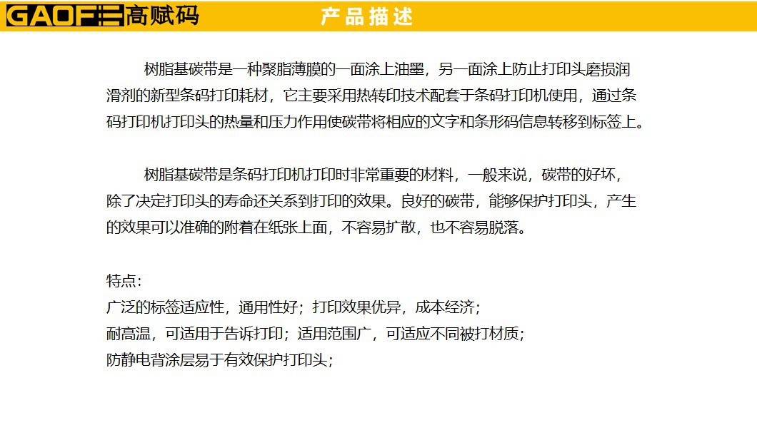 樹脂基碳帶品質高、高速打印性能,優異的耐磨擦、耐熱、耐腐蝕、耐久性能,耐磨能滿足各種苛刻環境要求,高敏感度,確保優異的圖像打印效果,防靜電背涂層,有效保護打印頭。